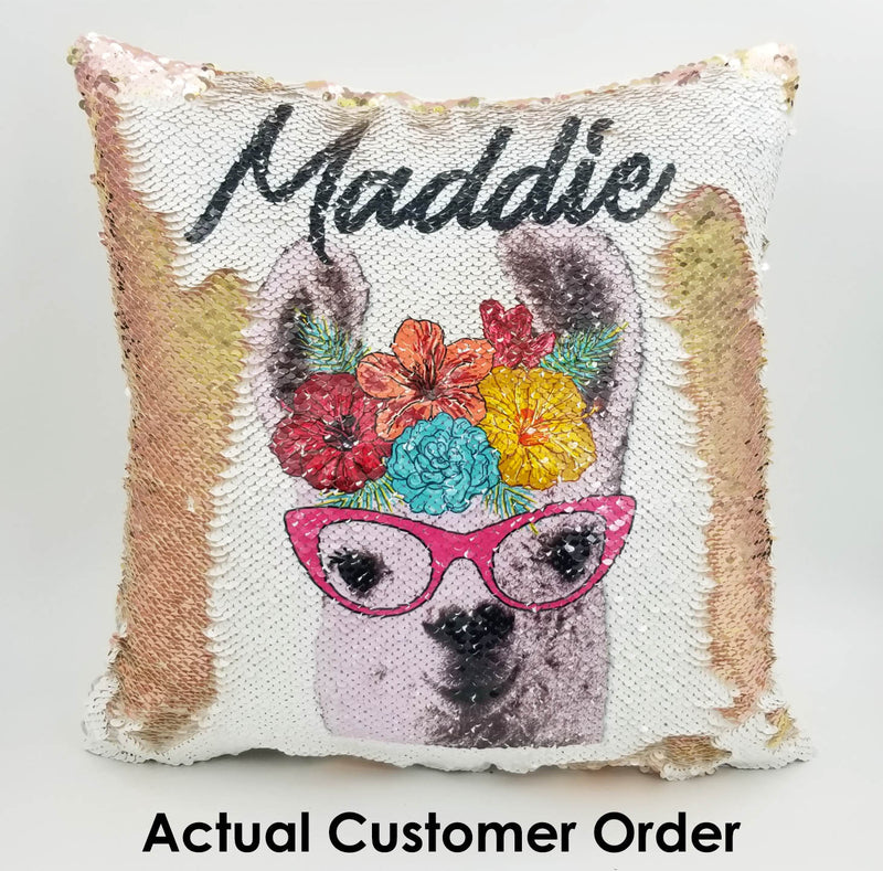 Sequin Pillowcase is approximately 16"x16" reversible sequins with soft, plush white velvet-feel back. Select from your choice of Blue or Yellow artist-designed mosaic Pit Bull design pillowcase.